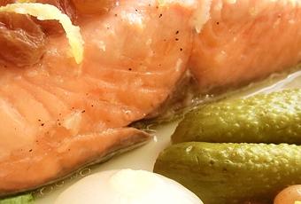 Adagiamo i tranci di salmone in un vaschetta, saliamo, pepiamo e aggiungiamo l'aceto. Lasciamo marinare i tranci in frigorifero per 40-50 minuti.