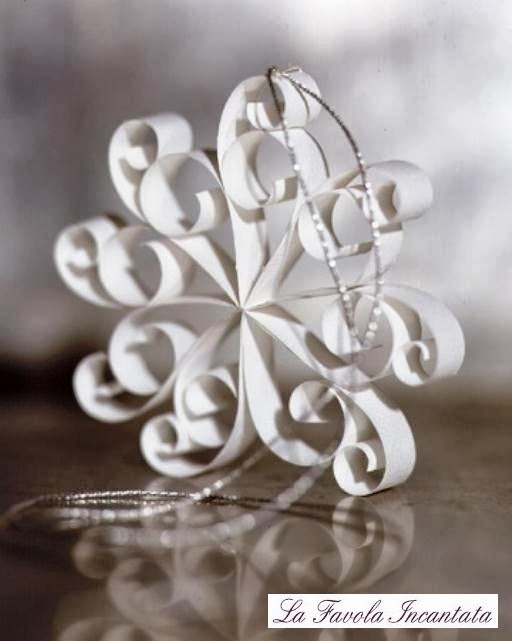 Infatti, la forma realizzata è una stella a 8 punte. Per farle vi serve una lunga striscia da piegare in due. Sulle estremità di questa formate due riccioli, uno più largo e uno più stretto|come vedete in foto qui sotto|.Infine, una volta asciugato il tutto, prendete un nastrino sottile o un filo glitter e legatelo ad uno dei riccioli, così potrete appendere la vostra decorazione homemade. Che ne dite, non è carinissimo?Per realizzare il fiocco di neve che vedete in foto, in realtà, serve davvero poco tempo e nessuna particolare capacità. Prendete delle striscioline di carta, avvolgetele ma solo all’ estremità per ottenere dei riccioli. Ilriccioloche ne verrà fuori sarà piuttosto stretto, ma giocando con le mani, allargando un po’ lo stesso, darete la forma e lo spessore che desiderate. Fate quest’operazione 8 volte, tante sono le striscioline che servono per realizzare questo fiocco.