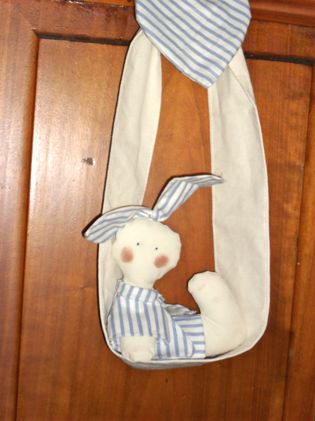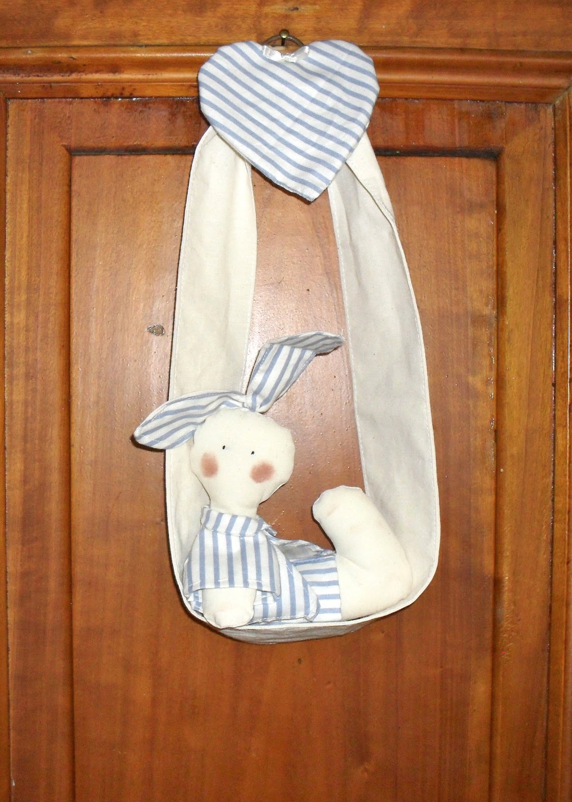 Mi è stato richiesto da una mia amica e questo è il primo che realizzo ma mi sembra carino...Naturalmente è un pò grezzo ( le stoffe non sono il massimo!!) ma penso che per quello "ufficiale" userò del lino bianco e una stoffina tilda azzurro pallido e poi ricamerò il nome del bimbo a punto erba