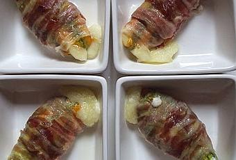 L'idea è stata mettere un pezzettino di provola all'interno di ogni fiore e poi foderarlo con della pancetta.Temendo che come ogni primizia anche questi fiori sapessero di poco ne abbiamo presi solo 4, giusto uno a testa per ampliare l'antipasto.Tutto in forno per una 15 di minuti.Ecco da provetti non abbiamo pensato al fatto che la provola (giustamente!) sciogliendosi avrebbe perso un po' della sua acqua...E così noi ci siamo ritrovati con una cocotte poco fotografabile per il blog e poco coreografica per essere presentata a tavola e allora che fare?Ce la siamo cavata con un cambio in itinere di caccavella e abbiamo posizionato ogni fiore separatamente, così: