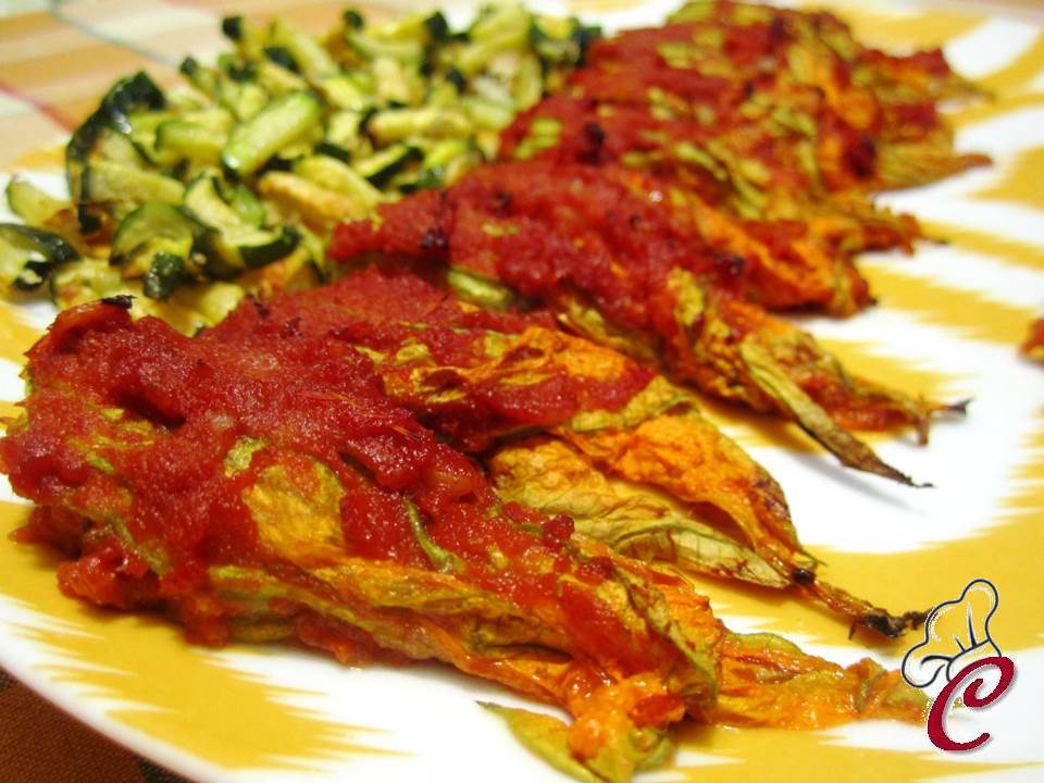 Trasferiteli su un piatto e accompagnateli con verdura di stagione. Io ho trovato perfette delle zucchine tagliate a julienne e dorate in forno. A voi il vostro contorno preferito.Il formaggio è presente in quantità giusta, affinché il piatto rispetti i canoni del light. La verdura si manifesta in ogni sua forma e il sapore non si risparmia sicuramente. Quindi..... rimboccatevi le maniche e provate questi fiori, perché sono la fine del mondo!!!!