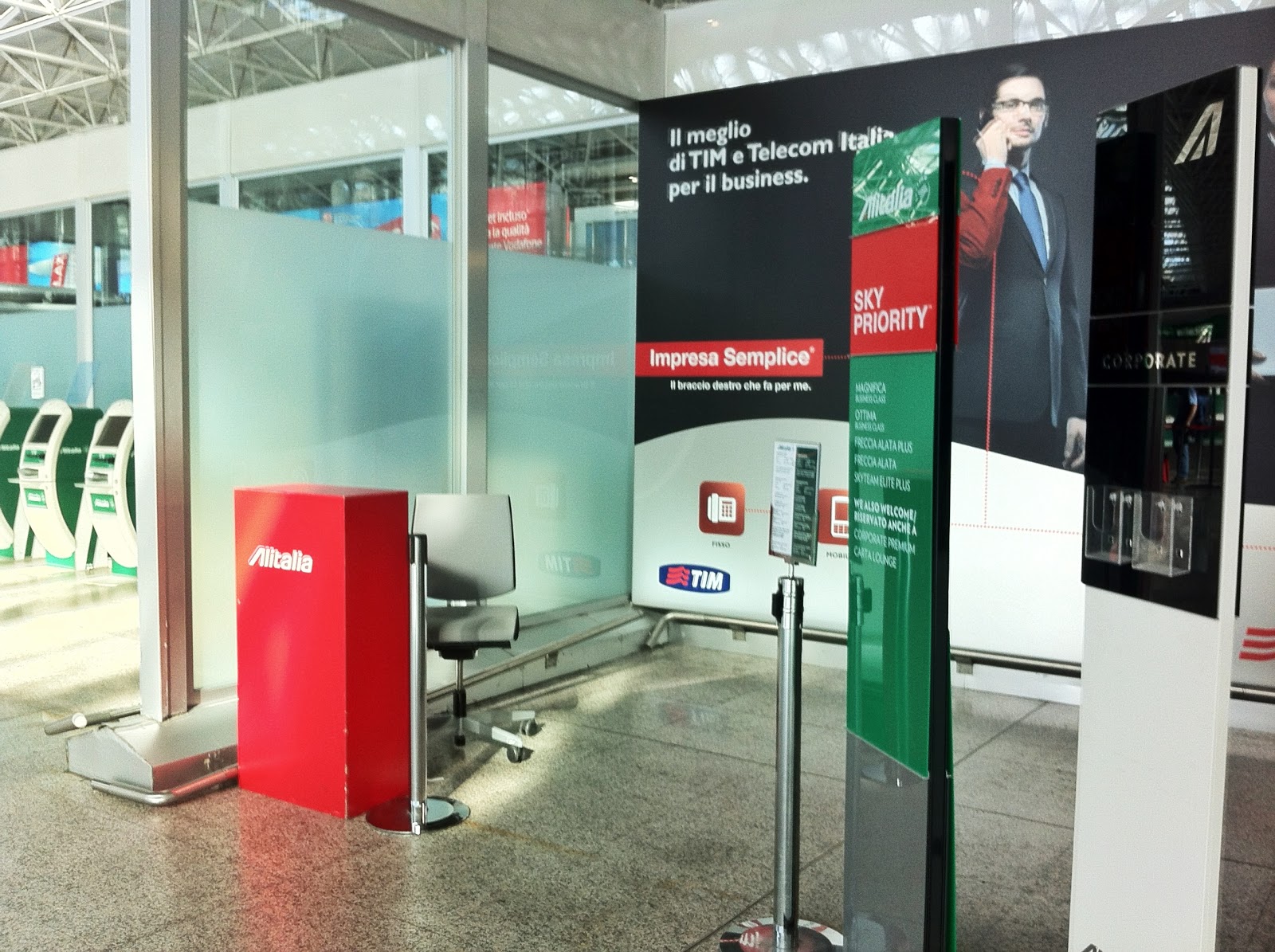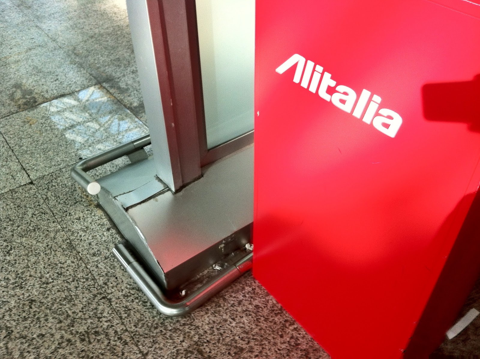 Questo è il varco di accesso "prioritario" per i passeggeri di prima classe e frequent flyers di Alitalia. Potremmo anche tralasciare il fatto che il collega è costretto a rimanere seduto dietro un banchetto orribile e fatiscente (quello rosso, con la scritta mezza cancellata) facendo la figura del fesso, ma decisamente più grave è ciò che sta dietro quest'ultimo. Una serie di tubi e strutture completamente spaccate, danno quel tocco retrò al tutto, non voglio sapere cosa potrebbe succedere se un passeggero o un lavoratore inciampasse in uno di quei tubi.