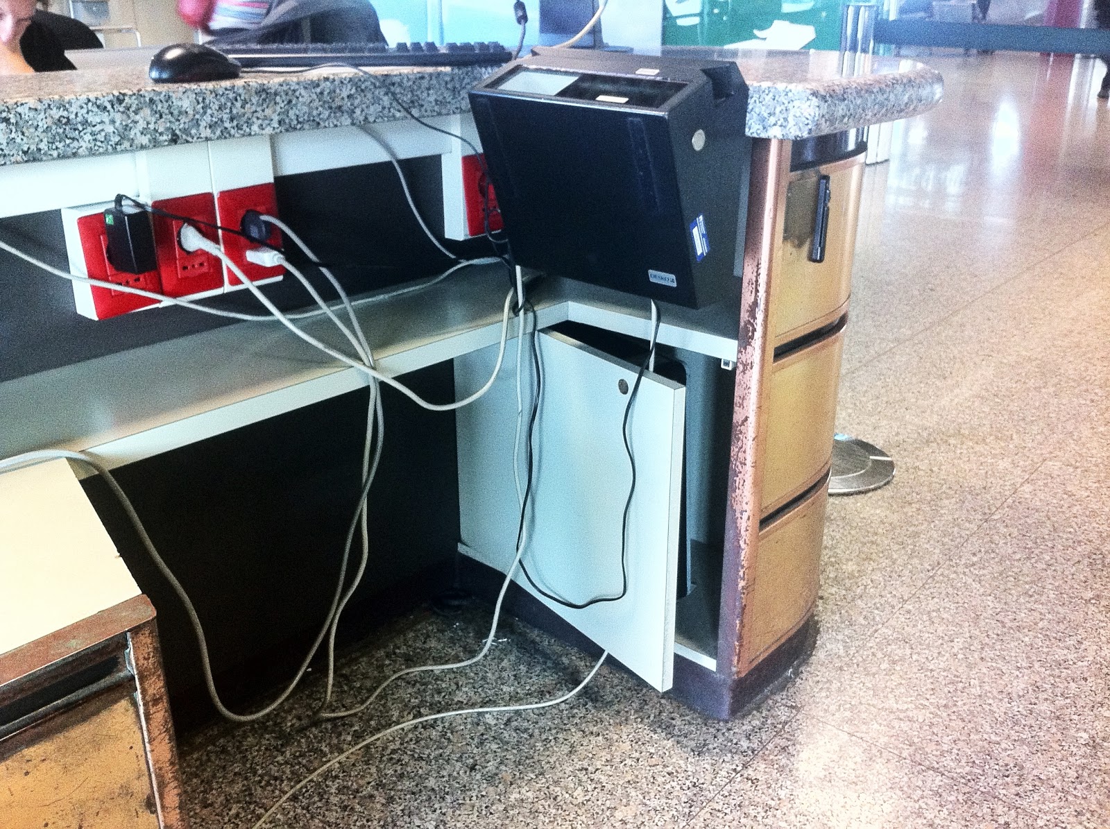 Ecco qui come l'aeroporto "saluta" i passeggeri in partenza, con un bel po' di degrado. I Gates sono sporchi e fatiscenti, gli addetti lavorano in condizioni di pochissima sicurezza (fili elettrici sparsi, acqua che cade dal soffitto, mancanza di riscaldamento o aria condizionata, vetri rotti) e i turisti assistono a scene assurde. Qui vediamo il disordine totale dei cavi elettrici e dei computer sui banchi dei gates dell'area B ad esempio, dove non si può sostituire un vetro rotto ma si preferisce riempirlo di nastro adesivo (hai visto mai che qualcuno si faccia male).