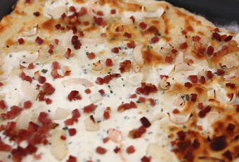 Come vedete dalla foto, la Flammkuchen è un’ottima alternativa alla pizza: l’impasto è molto simile, ma alla cottura risulta più bassa e più secca. Il condimento con cipolla, speck e formaggio, la rende davvero irresistibile.