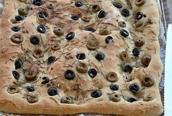 Ho messo nella planetaria il sale, sopra la farina, poi l'olio extravergine di oliva e lo zucchero. Ho sciolto il lievito in acqua tiepida che ho aggiunto, poco alla volta, man mano che il robot impastava la farina fino ad ottenere un impasto liscio e compatto. Ho coperto con pellicola e fatto riposare fino al raddoppio per almeno 4 ore. Quindi ho ripreso l'impasto e con le mani infarinate l'ho steso sopra un foglio di carta forno posto all'interno di una teglia da forno, allargandolo con le mani fino a coprire quasi il rettangolo della teglia, ho aggiunto delle olive verdi e nere sgocciolate e tagliate a rondelle e degli aghi di rosmarino, ho lasciato lievitare ancora per alcune ore. Ho cotto in forno già caldo a 200° per 20 minuti.