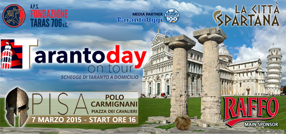 Nato per radunare i tarantini fuorisede attorno alla comune passione calcistica, il Taranto Day On Tour, giunto alla sua quarta edizione dopo le tappe di Roma, Bologna e Milano, si propone di portare in giro per l’Italia schegge di tarantinità, condividendo l’esperienza della Fondazione Taras come supporters’ trust e raccontando la Città dei Due Mari attraverso ed oltre le vicende pallonare.L’appuntamento è a Pisa il prossimo sabato 7 marzo, a partire dalle ore 16. Sede dell’evento sarà il Polo Didattico Carmignani, nella centralissima Piazza dei Cavalieri, a due passi dalla Scuola Normale e dalla Torre Pendente.