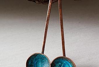 Un tocco di colore le completa. La patina blu mi ha fatta penare, e l'ho rifatta più volte, alla fine questo effetto del colore incrostato, con diverse sfumature, è un bel risultato. Per lasciare la massima semplicità e purezza di queste forme ho scelto di usare il perno saldato e la farfallina, entrambi in argento 925.