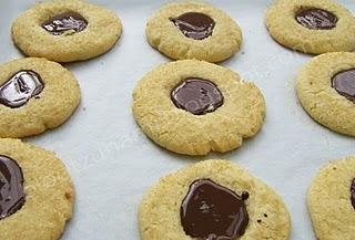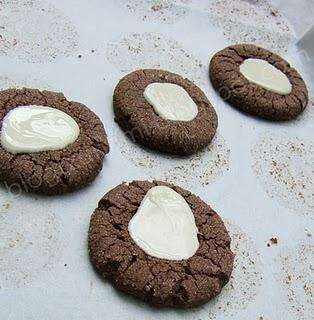 Per la versione bianca invece di mettere il cacao, lasciate 50 g. di farina in più...per un totale di 350 g. di farina ed al posto dello zucchero bianco usate quello di canna, ovviamente per bicromia il cioccolato sarà quello fondente.Mentre si cuocevano i biscotti io ho fatto sciogliere il cioccolato bianco a bagno maria (non vi sto a raccontare le storie su 'sta maria che ne sono uscite)...sfornati i biscotti ed aspettato il tempo tecnico per un minimo abbassamento della temperatura, ho riempito ogni fossetta con il cioccolato fuso.
