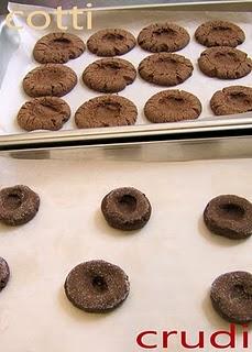 A questo punto entra in ballo lo zucchero, ne abbiamo messo un po' in un piatto di carta e una a una abbiamo "puciato" metà parte delle nostre pallette, le abbiamo adagiate con la parte zuccherata verso l'alto e con in ditino abbiamo creato la "fossetta"...volendo voi potete utilizzare anche uno strumento con la parte arrotondata.