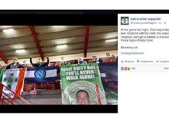 “Stiamo portando la bandiera del Napoli in giro per tutta la Scozia con il Celtic in questa stagione. Speriamo di giocare un’amichevole in estate. Forza Napoli, Forza Celtic“. Questa la traduzione del significativo messaggio apparso su una pagina Facebook dei tifosi del Celtic, che manifestano tutto il loro appoggio e supporto alla squadra ed ai tifosi partenopei. Dall’inizio della stagione, infatti, la bandiera del Calcio Napoli è calata dagli spalti del Celtic Park, lo stadio di casa, e dalle ringhiere degli stadi di tutta la Scozia.