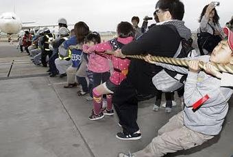 Ci sono tutti: hostess, comandanti, miss Giappone e 200 tra bambini e ragazzi (4 ai 14 anni). Hanno partecipato insieme ai genitori, all'aeroporto Haneda di Tokyo, a un singolare gioco benefico: spostare di almeno due metri un aereo pesante 85 tonnellate. Obiettivo raggiunto. I fondi raccolti andranno ai familiari delle vittime del terremoto della prefettura di Iwate
