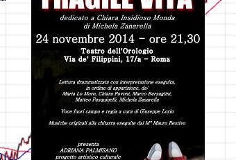 Il 24 novembre 2014 alle ore 21.30 al Teatro dell’Orologio, in via de’ Filippini 17/A l’ APS Le Ragunanze in collaborazione con “Non solo Chiara”, “Italia dei Valori” e il Polo Chitarristico Italiano “Carlo Carfagna” presenta “Fragile vita, dedicato a Chiara Insidioso Monda”. Lo spettacolo patrocinato dalla Regione Lazio e Amnesty International Sez. Italiana è concepito come operazione nobile per sensibilizzare l’opinione pubblica alla problematica del rito abbreviato, che vedrebbe libero l’assassino dopo pochi mesi dalla tragedia. La pieces è stata dedotta da colloqui con il padre di Chiara, da testimonianze degli amici di Chiara, da articoli ed interviste che i diretti interessati hanno rilasciato ai giornali. La lettura drammatizzata vede in ordine di apparizione: Maria Lo Moro, Chiara Pavoni, Marco Bersaglini, Matteo Pasquinelli, Michela Zanarella. Voce fuori campo e regia a cura di Giuseppe Lorin.