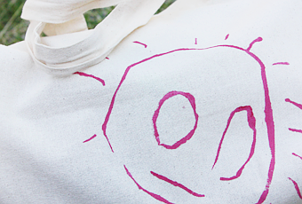 Epilogo. A tutti quelli che mi fanno i complimenti perché riesco a far queste cose con i bambini, sappiate che la maglietta si è macchiata mentre dipingevo a quattro mani con mio figlio, che è riuscito mentre cercavo di riparare il danno a tingersi anche la sua maglietta nuova. Mentre ero in bagno che lavavo via il lavabile dai tessuti, il piccolo ha dipinto di bianco il pavimento della sala. Il risultato è che ho pulito tutto e poi mi son chiusa in cucina a stamparmi la borsa, per questo i materiali nelle foto non corrispondono. Sii zen, come no. E dopo la lavatrice cercherò di sistemare alla bell’è meglio la maglietta per papà… così, dopotutto, impara a sbagliare carta.