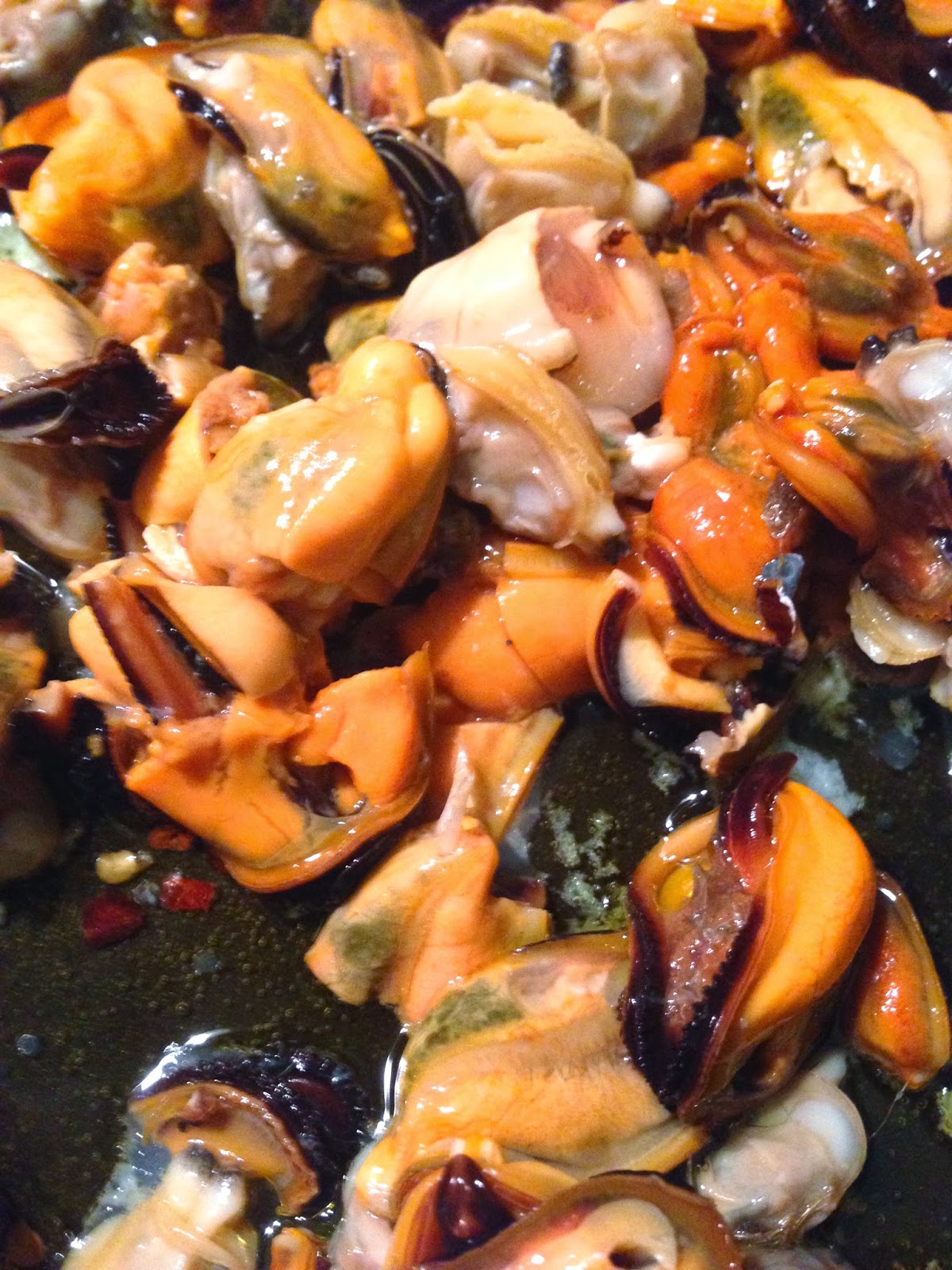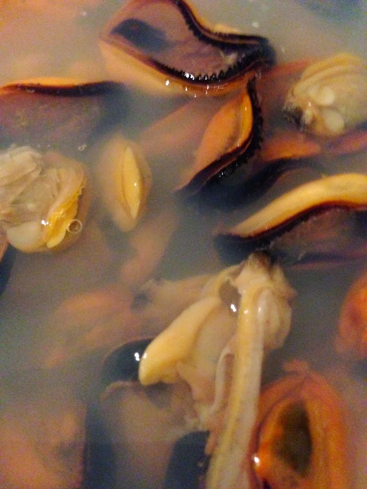 Once opened remove mussels and clams from their shells, keeping and filtering their water.