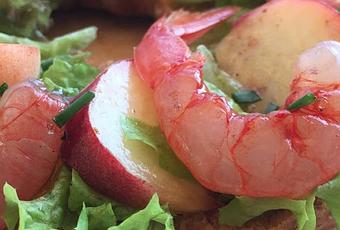 Disporre l'insalata e le pesche sulle friselle e sistemare i gamberi sgoccioli tari dalla marinata, terminare con un filo d'olio, l'erba cipollina tagliuzzata con le forbici da cucina e qualche cristallo di sale.