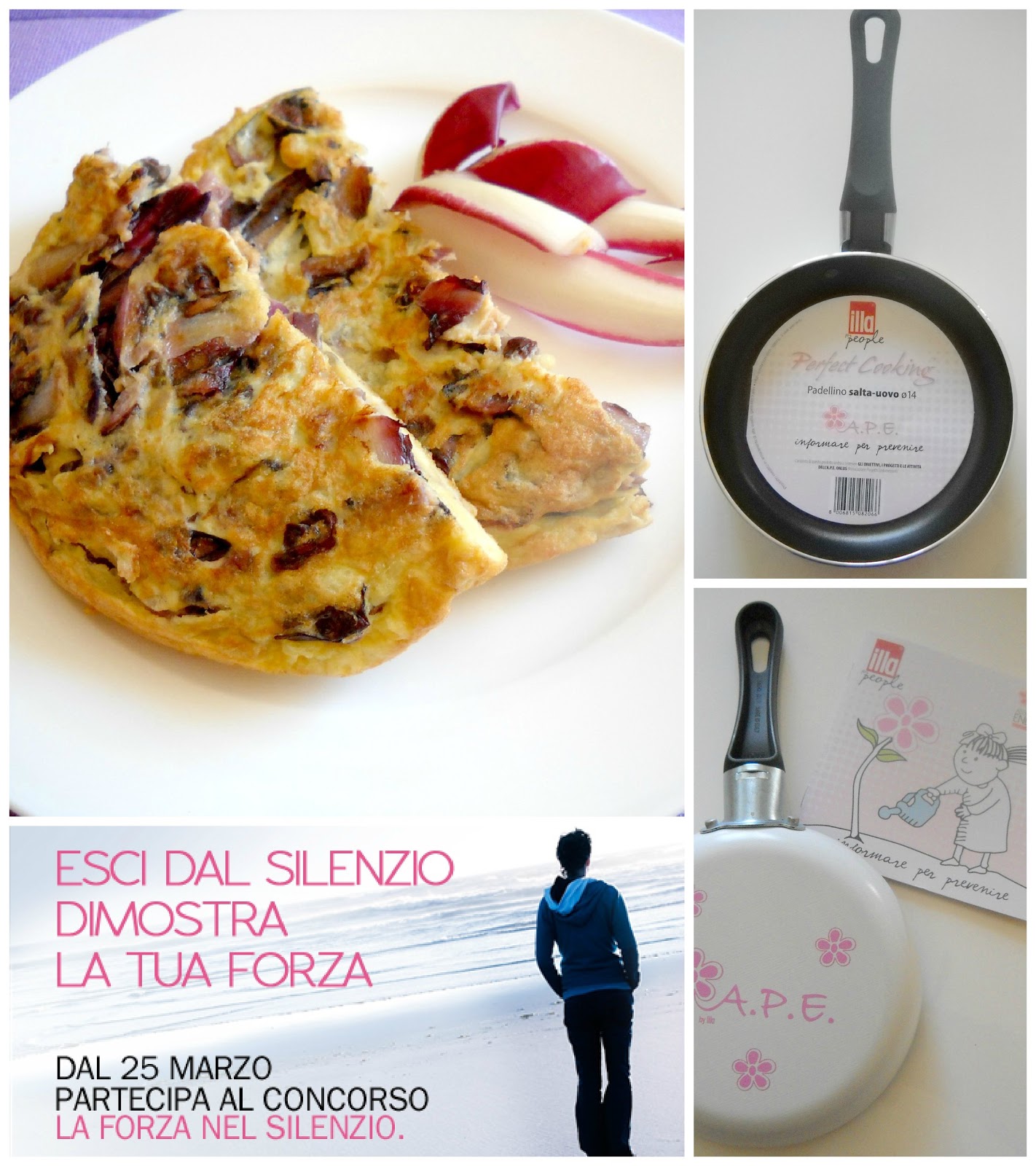 Io con questo delizioso padellino ho realizzato delle gustosissime mini frittatine, provatele!!Pulite 4 cespi di radicchio rosso di Treviso tardivo, lavatelo accuratamente e asciugatelo in un canovaccio, quindi riducetelo a striscioline. Sbucciate una cipolla e tagliatela a fettine sottili. Fate scaldare in una pentola d'alluminio 2 cucchiai di olio, aggiungete la cipolla e lasciatela soffriggere a fuoco dolce per 5 minuti, unite il radicchio, salate e cuocetelo per circa 15 minuti, fino a quando sarà morbido. Bagnate con due cucchiai di aceto rosso, fatelo evaporare mescolando e lasciate intiepidire. Sgusciate 6 uova in una ciotola, salatele e sbattetele con una forchetta, quindi incorporate 30g di farina fatta scendere da un setaccino e 3 cucchiai di latte. Amalgamate al composto 30g di Parmigiano grattugiato e il radicchio. Ungete d'olio il fondo della padellina Illa, fatelo scaldare bene e versatevi in più volte composto di uova distribuendolo uniformemente, lasciate rapprendere e dorare la frittata da un lato, poi giratela con l'aiuto di un coperchio e terminate di cuocerla anche dall'altro lato.Servitele le mini frittatine con qualche foglia di radicchio tagliata a striscioline.