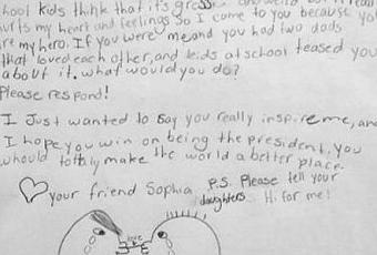 Caro Barack Obama,sono Sophia Bailey Klugh. La tua amica che ti ha invitato a cena. Se non te lo ricordi va bene lo stesso. Ma volevo solo dirti che sono felice che sei d’accordo che due uomini possano amarsi perché ho due papà e loro si amano. Ma a scuola gli altri bambini pensano che sia disgustoso e strano e questo mi ferisce. Ti scrivo perché sei il mio eroe. Se tu fossi in me e avessi due papà che si amano, e i bambini a scuola ti prendessero in giro per questo motivo, cosa faresti?? Per favore rispondimi!? Volevo solo dirti che mi sei d’ispirazione e spero tu vinca e diventi il presidente. Renderesti il mondo un posto migliore