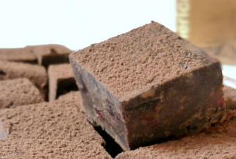 Procedimento:Foderare una teglia di circa 20 x 20 cm con carta forno.Mettere i mirtilli nel brandy e farli rinvenire per mezz'ora. Nel frattempo tritare al coltello il cioccolato, versarlo in un pentolino insieme al latte condensato e al burro e sciogliere a bagnomaria. Scolare i mirtilli e unirli al cioccolato. Versare il composto nella teglia, livellare bene e riporre in frigorifero per due ore. Togliere dal frigorifero, rovesciare sul tagliere e tagliare a cubetti. Setacciare abbondante cacao su un vassoio, sistemare sopra i cubetti e setacciarne dell'altro sopra.Ahhhh la felicità!!!!!.......Per conservarli dato il caldo che fa, coprire e mettere in frigo. Tirare fuori dieci minuti prima di consumare.