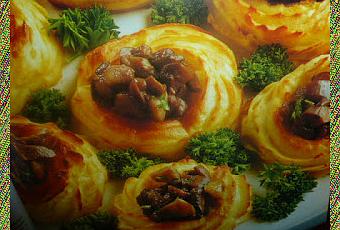 disponete la purea di patate in anelli regolari sulla placca del forno e riempitene il centro di funghi e fegatini pennellate di uovo e passateli sotto il grill a gratinare