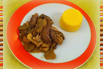 Per la polenta: portate l’acqua ad ebollizione in una pentola con il fondo spesso e salate. Togliete la pentola dal fuoco e aggiungete -la polenta, rimestando continuamente con una frusta. Riportate la pentola sul fornello e a fuoco basso girate la polenta per 5 minuti (o quanto indicato sulla confezione della polenta). Versatela ancora calda in uno stampo per muffin con l’aiuto di un mestolo. Lasciatela intiepidire e servitela con funghi, pollo e salsiccia.