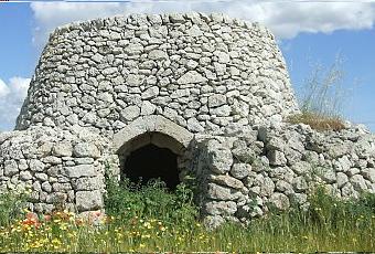 Lo sguardo sul paesaggio consente di scorgere sulle creste delle colline, spesso in posizione dominante, imponenti edifici rurali che prendono il nome di masserie, bagli e cascine. Questi edifici furono costruiti al servizio di grandi aziende specializzate nella trasformazione dell’uva e delle olive in vino e olio, o al servizio di aziende cerealico-zootecniche. La costruzione rispondeva a diverse esigenze dei grandi proprietari, tra cui quella della sicurezza, infatti nelle campagne è da sempre presente il pericolo dovuto alla presenza di briganti. Ciò spiega come questi edifici abbiano a volte l’aspetto di una fortezza con il muro alto e di grosso spessore, nel quale si apre un solo portone d’ingresso assai robusto e spesso rinforzato mediante l’applicazione di lastre metalliche chiodate per difenderlo da eventuali tentativi di darlo alle fiamme. Altra caratteristica di fortezza è data dalla presenza di poche e piccole finestre munite di grate di ferro molto elevate; e da feritoie nascoste (saettiere) dalle quali poter dare fuoco con le armi. Queste strutture servivano anche a ricevere, conservare e trasformare i prodotti agricoli dell’azienda in attesa di portarli al più vicino mercato per la vendita, e fungevano da abitazione o dimora del personale fisso e temporaneo alle dipendenze del proprietario. Come detto, il cortile interno caratterizza masserie, bagli e cascine. Nei più grandi si trovano due cortili, uno di pertinenza dell’abitazione padronale, l’altro degli edifici rustici, comunicanti tra loro e con l’esterno. L’ingresso di solito è costituito da un grande portone ad arco in ferro o in legno e immette in un sottoportico (turchettu), nel quale si trova uno o due rudimentali sedili in pietra addossati alle pareti. Il portale ad arco è costituito da blocchi squadrati di pietra dura o in mattoni, sormontato in quelli sorti prima dell’abolizione della feudalità (1812) dallo stemma nobiliare della famiglia. Al centro del cortile, pavimentato con lastre di pietra (basolato), vi è quasi sempre un pozzo o una cisterna. Lungo i lati del baglio si sviluppano gli edifici adibiti a usi e funzioni diversi.