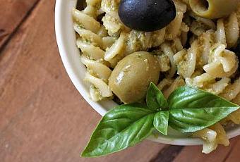 Pulite le foglie di basilico e mettetele nel bicchiere del mixer, aggiungete lo spicchio d’aglio, le olive, il parmigiano, 1 cucchiaino di sale grosso, metà dei pinoli a vostra disposizione e i gherigli di noci. Frullate fino a ottenere un composto omogeneo. Versate l’olio a filo e frullate ancora per qualche istante. Poi trasferite il tutto in una ciotola.