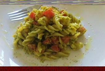 Condire la pasta scolata al dente e raffreddata con la salsa e i pezzetti di gambero, mescolare e lasciare riposare a temperatura ambiente.