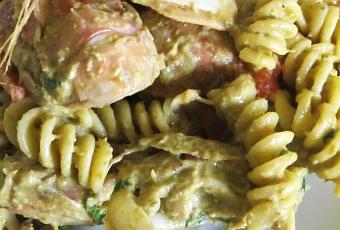 Saltare per un minuto la pasta cotta bene al dente nella padella dei crostacei, togliere dal fuoco ed unirvi il pesto mescolando il tutto.
