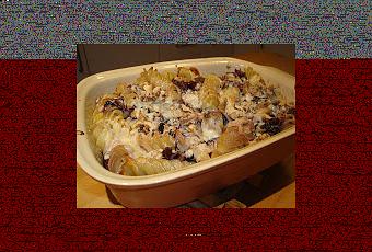 Lessare la pasta; nel frattempo rosolare lo scalogno tagliato fine con una noce di burro e poco olio, unire il prosciutto tagliato a striscioline e far rosolare. Unire anche il radicchio a striscioline e cuocere con il coperchio 5 minuti unendo anche poca acqua di cottura della pasta. Aggiungere sale, pepe e quando vedete il radicchio appassito e cotto anche una manciata di noci tritate grossolanamente (a me piace che si sentano in bocca). Scolare la pasta e mantecare con il sugo. Imburrare una teglia da forno e stendere un primo strato di fusilli, poi cospargere di pezzettini di fontina a fette e parmigiano grattugiato e proseguire con un altro strato fino ad esaurimento ingredienti. In superficie mettere altre noci e abbondante parmigiano per fare una crosticina in cottura.