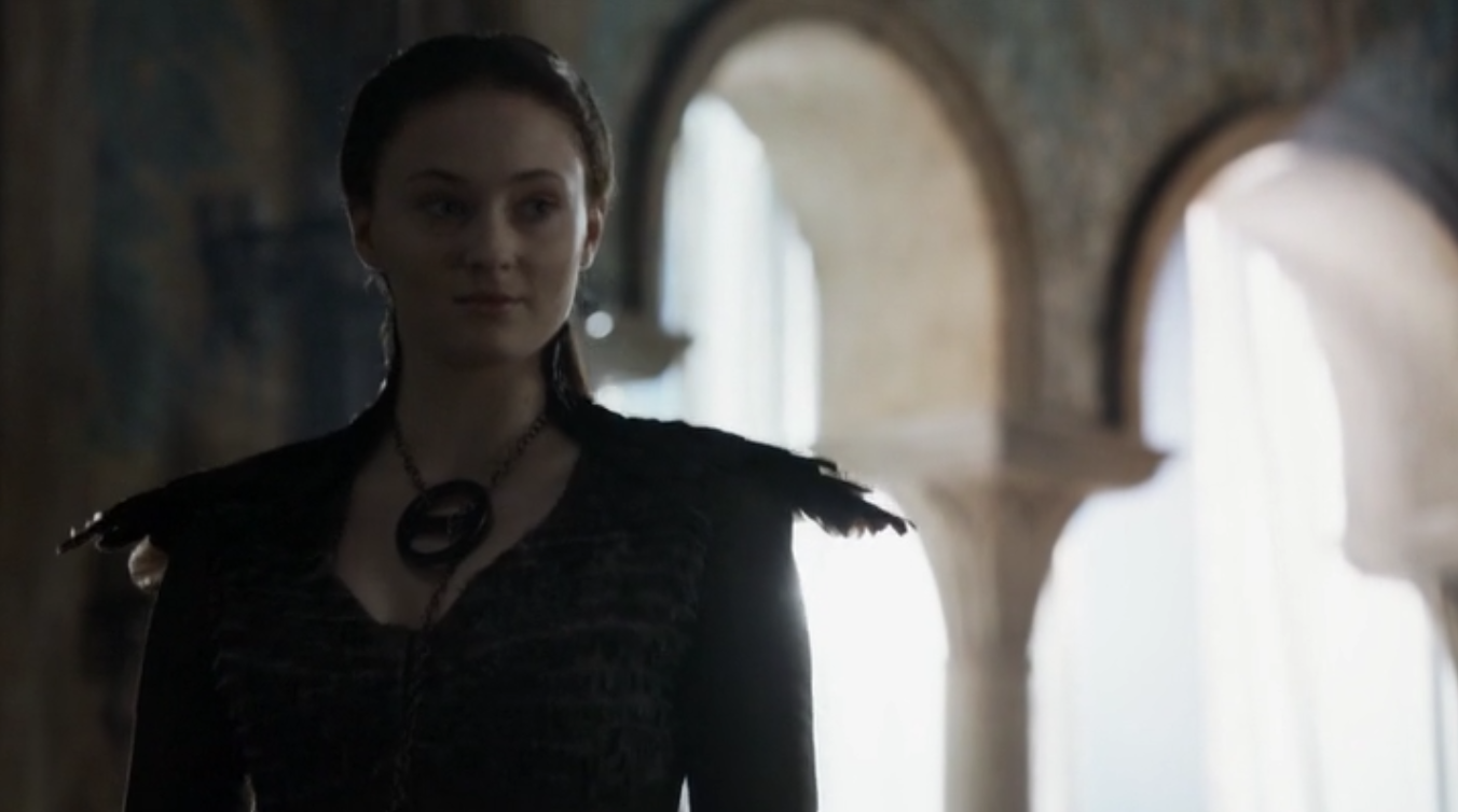 - La trasformazione finale è stata interessantissima da guardare. Non ho la più pallida idea di dove si stiano dirigendo con Baelish, ma vedere Sansa tingersi finalmente i capelli (perché Alayne ha i capelli scuri) e vestirsi con tanto di abito nero da femme fatale quando fino a pochi episodi prima (o anche questo stesso episodio) sembrava una vergine dolce e casta... È stato fantastico. Inoltre cosa vorrà dire questo abito da cigno nero-Maleficent? Sarà davvero una svolta nel suo personaggio?