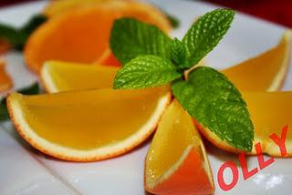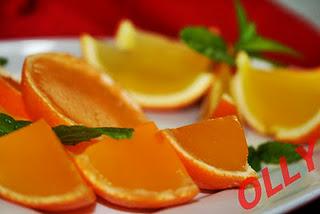 Spegnere il fuoco e unire la gelatina ammollata mescolare bene e fare raffreddare , facendo attenzione alla temperatura che non deve essere troppo calda per non alterare il contenuto vitaminico, ma nemmeno nemmeno essere troppo consolidata . Aggiungete 1/3 di sciroppo al succo d'arancia, 1/3 al succo di limone,1/3 al succo di pompelmo, mescolare bene e poi versare nei rispettivi frutti svuotati. Mettere in frigo per almeno 4 ore, devono essere perfettamente consolidate per poterle tagliare a spicchi.