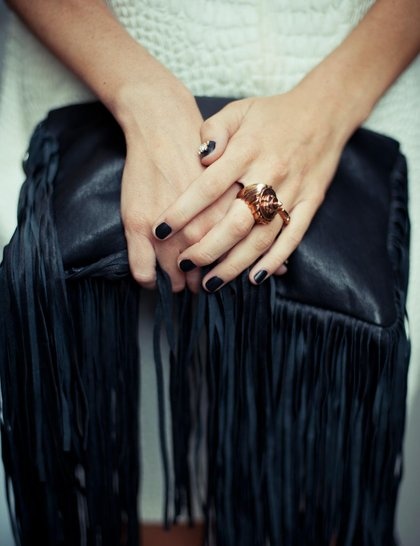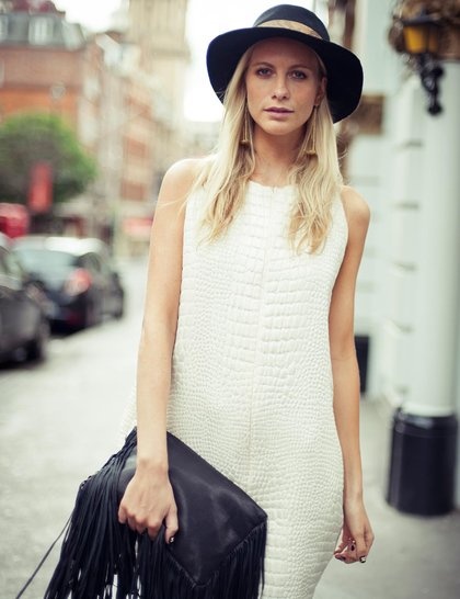 Frange, righe e pizzo saranno o sono già il nuovo must della nostra primavera estate 2013, lungimirante tre anni fa circa faccio incetta di maglie e magliette a righe navy stile, che io sono veggente si sà ;) compro cose che andranno di moda nei prossimi anni in anticipo anni luce o è solo un caso? Manca solo un bel vestitino bianco magari di pizzo da abbinare a una borsa con frange :) come Poppy Delevingne che qui indossa un magnifico Zoe Jordan a stampa rettile con borsa Barbara Boner
