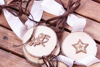 Per prima cosa decidere il colore che volete tenere per i vari materiali. Per me tutto marrone ma nel post precedente la ghirlanda era rossa. Per ottenere i dischetti, potete farvi tagliare un tronchetto di legno in tanti dischetti oppure potete far fare questa operazione presso i vari centri del fai da te; non è detto che li troviate già belli che pronti. Su un nastro, incollare con la colla a caldo tre dischetti a equa distanza calcolando nella parte superiore la piegatura per appendere la vostra ghirlanda; fate attenzione anche al dritto e al rovescio del nastro e soprattutto la direzione dei disegni. Una volta incollati i legni, incollare anche la piegatura. Prendere i decori e con la colla a caldo, porli sui primi due dischetti. Passare la raffia nel campanellino, formare dei fiocchi e incollarlo sull’ultimo dischetto. Sempre con la rafia, creare il fiocco nell’alto della ghirlanda. Porre le ghirlande in sacchetti trasparenti, fermarli con un fiocco e un’etichetta per il nome del destinatario.