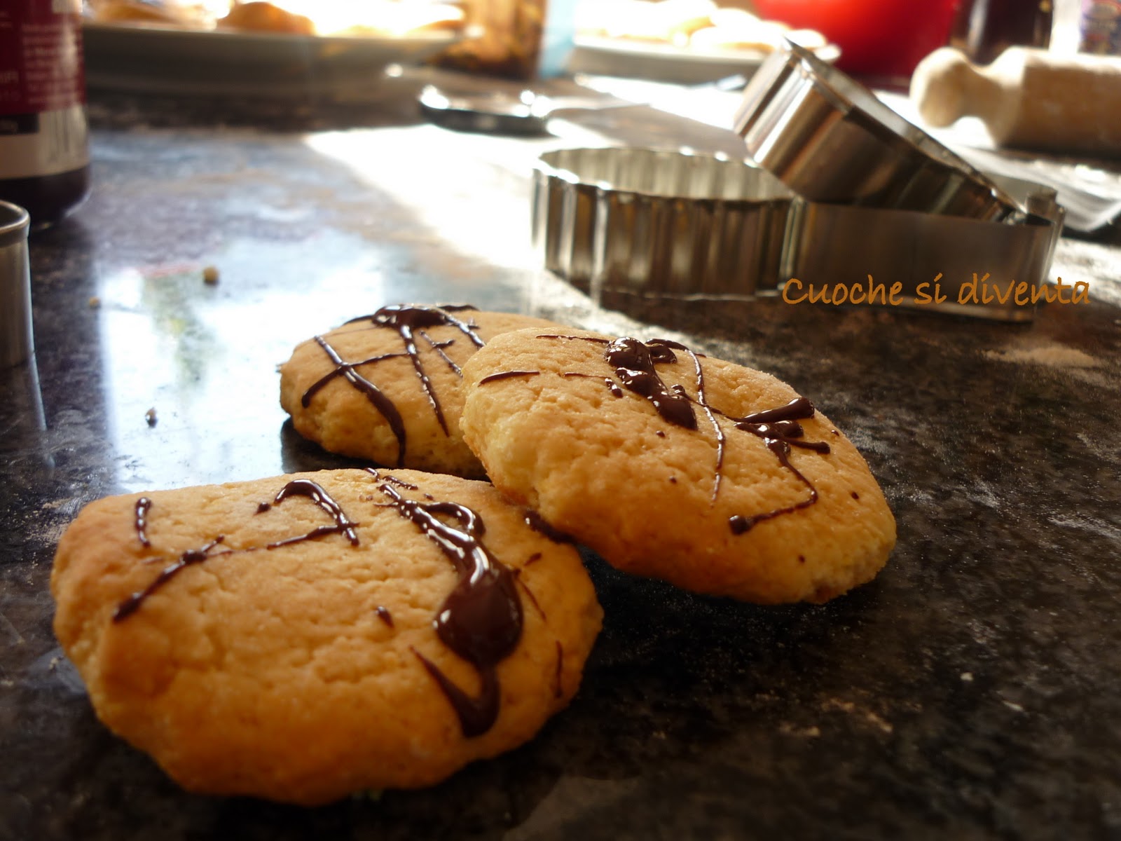 Abbiamo decorato altri con del cioccolato fuso messo “ a getto” sui biscotti già cotti e raffreddati