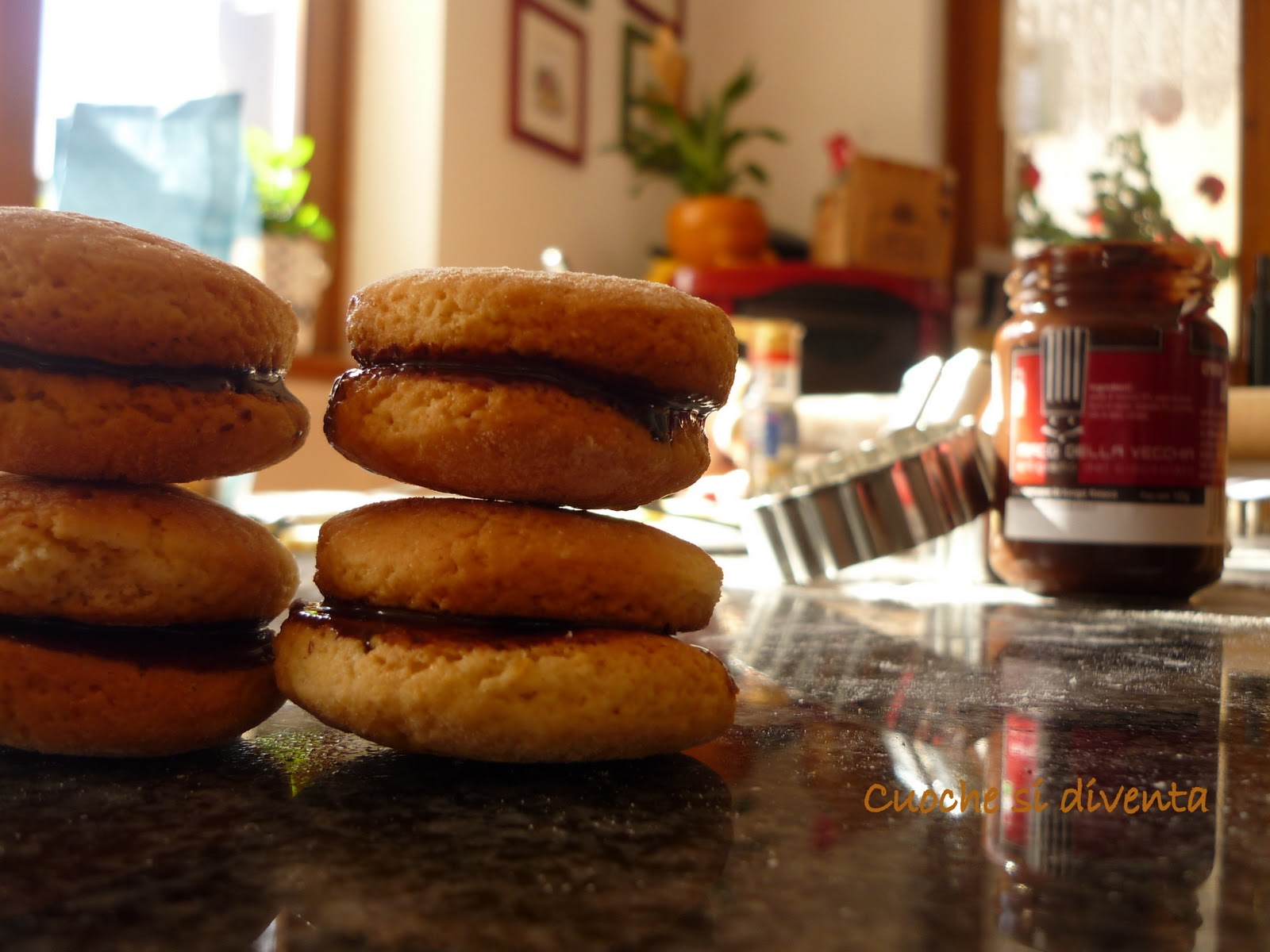 Ingredienti· Mezzo kg di farina· Una scorza di un limone grattugiato· 250g di zucchero· Una bustina di lievito· 2 uova· Un pizzico di sale· 100g di burroCome si procede Facciamo la tipica fontana con la farina e procediamo con il resto degli ingredienti formando una palla ben omogenea. Stendiamo la pasta e sbizzariamoci con la fantasia!!In forno a 200g per circa 10 minutiAlcuni consigliL’impasto va fatto rigorosamente a mano, pena la non riuscita efficace di questi biscotti! Le alternative da fare sono tantissime; Abbiamo fatto i tipici frollini tondi e, tra i due, abbiamo messo della crema all’amaretto di Mirko della Vecchia