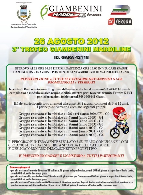 Ecco alcune foto della gara organizzata da Giambenini Maddiline a Ponton di S.Ambrogio di Valpolicella domenica 26/8 e riservata ai bambini/e tra i 5 e i 12 anni. Come potete vedere dalle foto i ragazzini/e sono sorridenti e carichi, segno che si sono veramente divertiti.