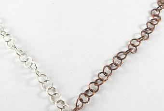 Il girocollo è creato interamente a mano. La catenella su un lato è in filo placcato argento e sull'altro in rame anticato. Il resto del girocollo è realizzato con elementi in filo di rame anticato.