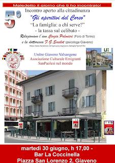 Forse é diventato necessario, spiegare agli amici che mostrano interesse per il nostro corso, cosa sono "gli aperitivi del corso" e perché ci muoviamo ogni volta in una location diversa. Abbiamo proposto all'Unitre Giaveno Valsangone, un tema sociale da affrontare insieme, abbiamo trovato adesioni importanti, di persone altamente qualificate, che hanno aderito gratuitamente alla nostra proposta. Abbiamo ottenuto, per il nostro corso, il patrocinio della città di Giaveno e dell'Assessorato alla cultura e, vogliamo sottolinearlo, per chiunque ci legge, questo riconoscimento per noi é IMPORTANTE. Vogliamo però anche proporre un ruolo diverso alla cultura nel nostro paese; perciò siamo noi:Associazione ed Unitre che ci proponiamo in modo attivo ai nostri concittadini, affinché comprendano che l'Università delle Tre Età, non é il cimitero dei brontosauri, ma è vera scuola che può dare una grande opportunità di conoscenza a chiunque si sente vivo e partecipe alla vita attiva: dai 18 ai 100! Per questo motivo ci rechiamo in ogni luogo in cui ci viene offertà ospitalità, per poter iniziare a far comprendere di cosa parleremo durante il nostro corso. l'aperitivo dell'argomento che sarà sviluppato dai nostri qualificati ospiti che terranno le lezioni, a cominciare dalle nostre avvocato Cinzia Palmieri e dalla psicologa F.Giovanna Sacilot, ai nostri eccezionali ospiti : Chiara Saraceno e don Ermis Segatti, don Fredo Olivero e la psicologa Anna Oliverio Ferraris, e ancora gli psicologi Leopoldo Grosso e Simona Rivolta. All' "aperitivo" ci prepariamo ad affrontare il tema, NON affrontiamo ora, né lo faremo durante il corso, temi e vicissitudini personali, storie private. L'"aperitivo" vuole solo essere un modo per conoscersi tra di noi, abituandoci a stare insieme intorno ad un tema di interesse comune. La location dei bar non è casuale: é il modo di usare un luogo di incontro comune, nel quale ci si ferma a prendere qualcosa che ci stimoli al pasto, per stimolarci a prendere parte ad un corso di studio che pensiamo di grande interesse. E proprio come per la consumazione di un aperitivo o di un caffè: OGNUNO PAGA IL SUO. perciò può partecipare ed intervenire chiunque. Vi Aspettiamo in tanti!