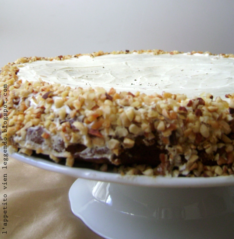 La lezione è chiara: mai chiedere ad un uomo di fare dei lavori domestici anche tra i più semplici perchè le conseguenze svantaggiose potrebbero essere notevoli. Se gli chiedete di sparecchiare potreste poi trovare un formaggio fresco in dispensa e un pacco di pasta in frigo; se gli chiedete di spazzare per terra potreste notare che con un movimento goffo cerca di pulire come meglio può ma poi vi accorgerete che sta maneggiando la paletta raccogli immondizia quasi fosse un ordigno nucleare e il vostro intervento-dimostrazione di come fare è immancabile(serviranno varie dimostrazioni prima di poter raggiungere un risultato apprezzabile); se gli chiedete di mettere nei vari cassetti i vestiti che voi avete stirato, le risposte alle domande del tipo:"eh ma questo dove lo metto?!Ma le calze dove vanno?!"vi faranno perdere più tempo di quello necessario per fare da voi, salvo poi rischiare di non ritrovare più l'unico maglione che era sicuro che dovesse essere messo nell'ultimo cassetto e senza chiedervi nulla aveva fatto di testa propria; se si mettesse a lavare i piatti poi dovreste fare un contratto agevolato con la Svelto: uno schizzo di detergente per ogni piatto; mai chiedergli una mano a rifare il letto: alla frase questa coperta la dobbiamo mettere in sotto e qui dobbiamo fare il risvolto potrebbe andare nella confusione più totale e per non farvi accorgere che non ha capito un tubo di quello che avete detto, potrebbe cominciare a dare delle forme strane a coperte e lenzuola improvvisandosi genio(incompreso) della biancheria. Togliendo tutte queste cosine ne rimangono poche che possono essere alla sua portata. L'altra sera mentre finivo di ripulire la cucina, ho chiesto alla cavia di riordinare alcune riviste di cucina sparse su sedie varie e di fare un pò d'ordine. Il soggetto, invece di limitarsi a riordinare si è messo a dare un'occhiata ed è rimasto molto colpito dalla copertina della Cucina del Corriere di qualche tempo fa(gennaio 2010). In effetti c'era la foto di una torta che faceva parecchia gola e subito si è avvicinato con la richiestina: "visto che l'ultima cosa che hai fatto era quella zuppa che a me proprio non piaceva, perchè per farti perdonare non mi fai questa?!". No dico, io gli faccio sistemare per mettere un pò di ordine e fare prima e lui mi trova un lavoro triplo?!! Nonostante le mia iniziale titubanza alla fine ho desistito(in effetti con quella zuppa l'avevo fatto scappare ;-)) e ho dato l'ok con la seguente avvertenza "fare questo dolce non sembra una cosa semplicissima, se non mi dovesse venire perfettamente si mangia lo stesso...". Accordi quindi presi e dopo poco metto le mani in pasta visto che avevo tutti gli ingredienti disponibili. La preparazione è stata un pò impegnativa(solo per grattugiare le carote ho impiegato circa trenta minuti) e l'impasto l'ho lavorato a lungo, però credetemi se vi dico che è stata una gran soddisfazione. E' una torta BUONISSIMA!!! Il sapore è particolare e mai stucchevole(se ne mangiano anche due fette di seguito). Esteticamente sembra una torta di pasticceria e non potete capire i complimenti che mi sono presa. La mamma della cavia è rimasta a bocca aperta, il padre sono convinta che lo trovo ancora che fa "UHM..."(l'ha mangiata con una foga che non vi dico), a casa mia si sono finiti tutto il pezzo a loro disposizione in meno di venti minuti. Insomma un successone. Vi consiglio vivamente di farla e mi saprete dire. Io l'ho fatta di sera e l'ho messa in frigo. La prima fetta è stata tagliata circa 12 ore dopo ed era buona, ma quella tagliata 24 ore dopo era di gran lunga superiore. Molto più compatta e saporita. Vi lascio la ricetta con le mie modifiche. Le dosi della glassa sono modificate poichè seguendo quanto scritto nella rivista a me ne è venuta poca. Con le dosi da me riportate ne viene a sufficienza.