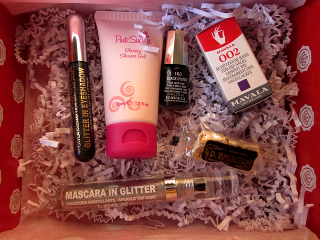 - due prodotti per unghie di Mavala (uno smalto nero glitterato da 5ml e una base protettiva per unghie, 5ml); due prodotti per gli occhi di Layla (un mascara glitter argentato 8ml, e un ombretto glitter tendente al nero, 6ml), un puff glitteroso (sempre di Layla) e un doccia schiuma Pink Sugar (50ml) + torroncino (che potrebbe uccidermi data l’allergia alle mandorle e noci XD)