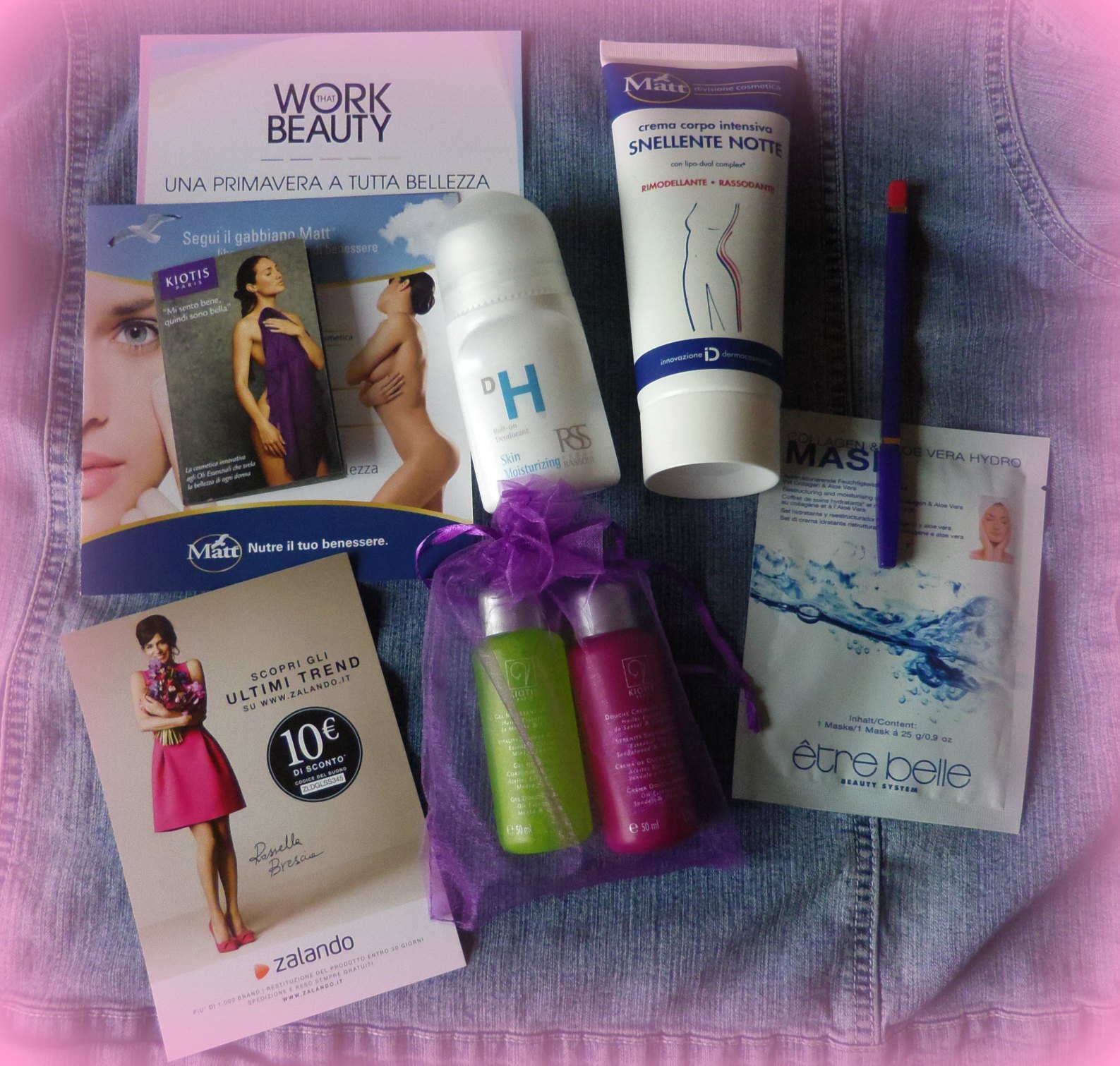 All'interno ho trovato una maschera per il viso al collagene ed elastina di Etre Belle : aiuta a prevenire l'invecchiamento cutaneo, fornisce un'intensa idratazione e restituisce un aspetto giovanile. Una crema snellente notte della Matt, in formato normale da 200 ml. Un deodorante roll on, anche questo in formato normale. Una matita labbra Dynamica color geranio. Un gel doccia vitalità agli oli essenziali di menta e limone e un crema doccia serenità agli oli essenziali di Sandalo e Ylang-Ylang della Kiotis.Un profumo buonissimo.