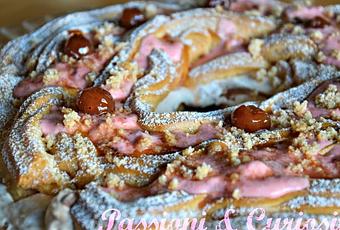 Foderare una teglia con carta forno e con la sac à poche formare degli anelli concentrici arrivando a un diametro massimo di 26-28 cm.