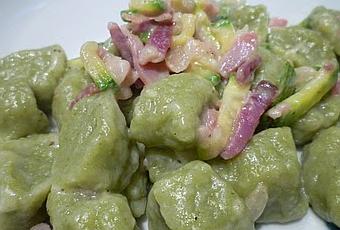 Ecco che gli gnocchi erano pronti. intanto che l'acqua arrivava a bollore, ho tagliato una cipolla rossa, una zucchina, e tre fette di speck a listarelle sottili.Ho fatto soffriggere la cipolla con il grasso dello speck e un po' d'olio, ho aggiunto poi le zucchine e lo speck. Ho fatto lessare il tutto in un mezzo bicchiere di latte. Non avendo panna a disposizione, il latte aiuta a smorzare e nello stesso tempo ad amalgamare i sapori. Una spruzzata di pepe e una girata d'olio (niente sale, visto che lo speck è già salato di suo) e ho fatto saltare gli gnocchi in padella dopo 10 minuti di cottura.Mio marito mi ha fatto i complimenti più e più volte: erano proprio buoni!!