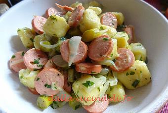 Che ne dite di un fumante piatto di gnocchi di patate conditi alla tirolese?Uso questo aggettivo solo per via dei wurstel, che naturalmente sono altoatesini doc essendo stati prodotti dal mitico Pizzinini della Val Badia. Se vi capitasse di essere in vacanza in zona, fate un salto nelle botteghe di macelleria della famiglia, a San Cassiano e La Villa. Sarà un'esperienza che ricorderete con l'acquolina in bocca.