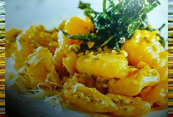 rosolate il burro con la salvia fino a che non sarà dorato scolate gli gnocchi con la schiumarola man mano che vengono a galla serviteli irrorando con il burro fuso e la granella di pistacchi