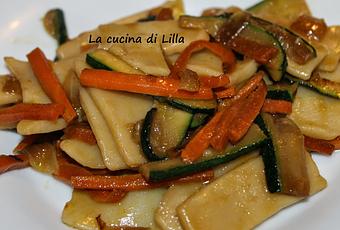 Nel frattempo preparare il condimento. Tagliare le carote e le zucchine a listarelle e la cipolla grossolanamente. Far saltare in padella le verdure con un filo di olio a fiamma molto vivace.
