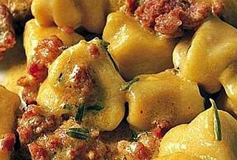 - Fate cuocere gli gnocchi in abbondante acqua bollente salata e insaporita con la bustina di zafferano, toglieteli con il mestolo forato non appena affiorano alla superficie, conditeli con il sugo di salsiccia e formaggio e serviteli subito.