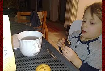 Accompagnata da dei biscotti. Io e lui, in attesa dei fuochi d'artificio.E' stato un momento assaporato, col mio bambino di cristallo, sempre vibrante, con gli occhi puntati su tutto, con mille domande. Nel privato canta, balla e si scatena, costruisce, sempre in moto... nel pubblico si nasconde, mi prende la mano, cerca sempre il mio sguardo. Se lo riprendo in tono più duro scoppia a piangere, realmente ferito, deluso per il fatto di essere delusa...E poi ha quegli occhi grandi, che s'ingrandiscono...