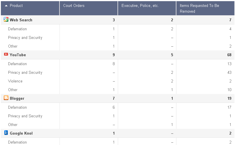 Per esempio, per quanto riguarda l'Italia (che non è il paese ad avanzare più richieste di rimozione) da luglio a dicembre 2011, ci sono state 28 richieste di rimozione, riguardanti 96 pagine, delle quali il 64% è stato accettato. Queste richieste provengono sia da organi giudiziari che da polizia o governo; la maggior parte ha riguardato contenuti su Youtube (n. 68). Il reato o infrazione maggiormente contestato è stato la diffamazione. Ecco la tabella tratta da Transparency Report
