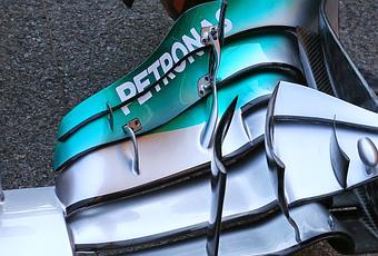 Sono stati portati piccoli interventi all'ala della Mercedes sul 5 flap aggiuntivo (quello colorato di verde marchiato Petronas). Come potete osservare dal confronto in basso è stata accorciata la corda di questo flap. E' stata inoltre introdotta una nuova soffiatura sul terzo flap aggiuntivo per migliorare la resistenza all'avanzamento senza penalizzare il carico deportante generato dall'ala.